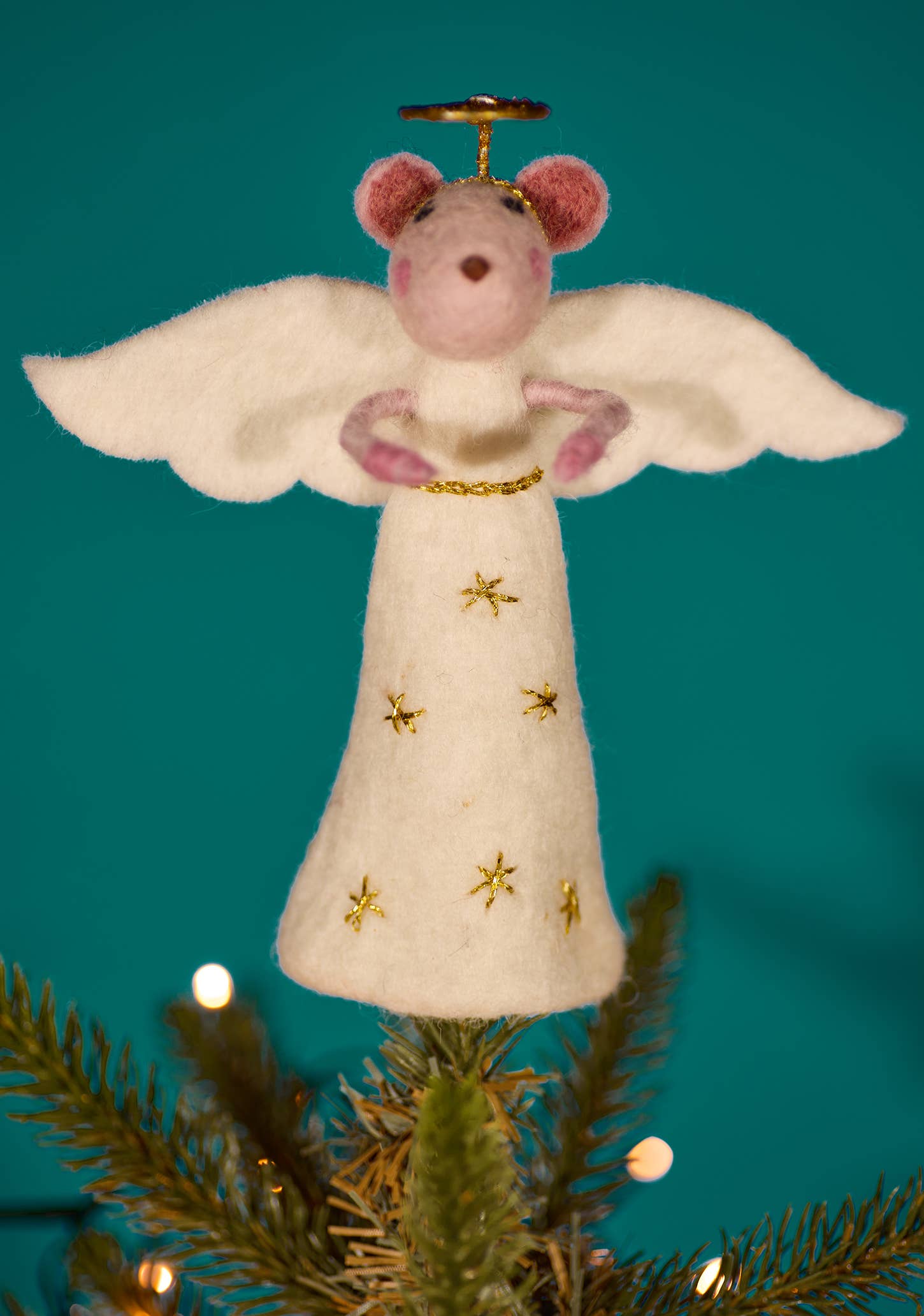 A white felt mouse angel complete with open wings and golden halo. This impressive tree topper stands regally in a gown embellished with gold threaded stars. Part of a funky new range of sustainable eco decoration ideas designed in-house at Namaste.